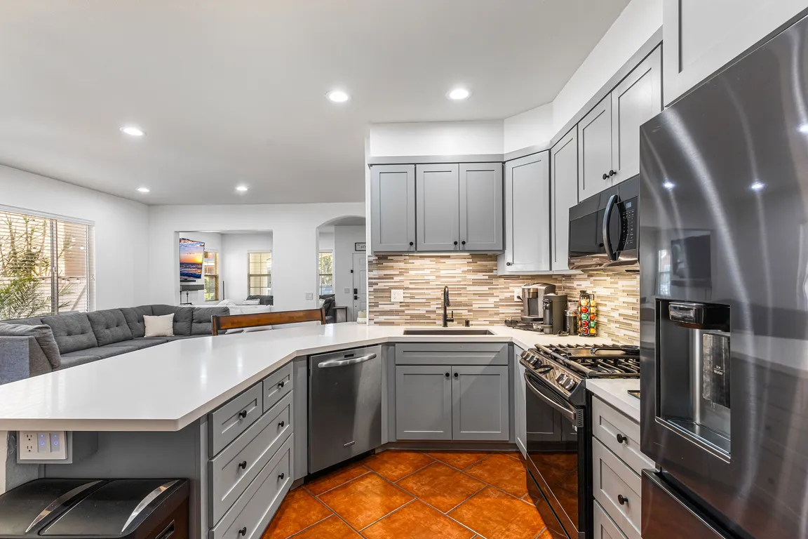 Private backyard oasisOpen-concept layoutUpstairs primary suiteDurable epoxy flooringCustom wood pergolaExtensive built-in storage cabinetryTile and hardwood flooring