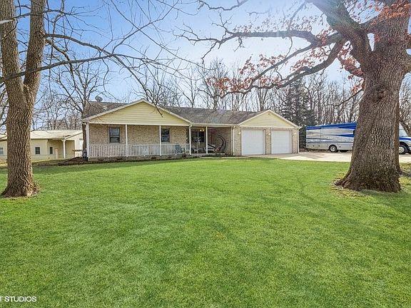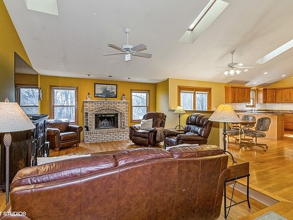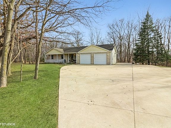 Open 2000 Sq Ft Ranch on 1.61 wooded acres with 43Wx52D outbuilding that includes 2 story garage, workshop with loft storage and private guest house with kitchen and full bath. Ranch home features open floorplan with sunken family room with fireplace, huge kitchen with dining area, hardwood flooring, solid oak doors, volume ceilings, three 1st floor bedrooms and two full baths plus full finished basement with large family room, living room area with fireplace, 2 additional rooms with closets and a full bath. Attached oversized 2+ car garage with two 10Wx9H doors. Concrete drive from street to backlot outbuilding. Outbuilding has 30'x52' garage with concrete floor, dual zone radiant floor heat (garage and guest house) 18Wx13'8H overhead garage door, 15'2 ceiling height and a partial loft for additional storage. Guest house has radiant floor heat,  kitchen with oak cabinetry, full refrigerator, oven/range, microwave and full bath with tub and shower plus the beautiful oak staircase leads to loft with hardwood floor and tongue and groove ceiling. This wooded property has a small creek running along the back and Black Walnut trees over the front and back of the lot for abundant privacy. The subdivision does not have an HOA and is in unincorporated Hinckley. The location of this beautiful home on private wooded acreage is minutes from downtown Hinckley and access to I-88 at Sugar Grove is less than 20 minutes away.  Many upgraded features in this home. 2x6 construction. Maintenance free fiber cement/Hardie Board siding. Upgraded mechanical septic. radiant floor heat in barn and guest house. ** Lifts in garage and outbuilding are not included in the price of the home but are negotiable. Security cameras are monitered. Please do not touch vehicles. **