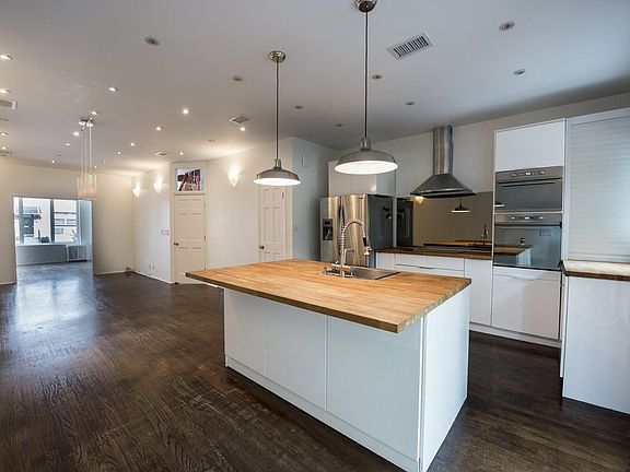 Rent directly from the owners of this stunning remodeled and contemporary residence in Greenpoint with central air conditioning. The property is located in a family friendly quiet street close to Greenpoint's excellent schools, McGolrick and McCarren parks, and all of Greenpoint's vibrant restaurants and bars. The unusually large space features large windows and a modern facade resulting in a one-of-a-kind living experience flooded by daylight. It is a unique home designed for a family to have plenty of space to live and host. First floor: features a large open kitchen dining, and living space with even level access to the deck facing the backyard. A chef's kitchen including an extra large kitchen island leave plenty of space to gather, prepare meals and share them with friends. An additional room with french doors can be used as artist space, office, kid's room, library or similar. A powder room completes the floor. Second floor: divided into 4 rooms and 2 bathrooms. The largest bedroom is the master bedroom with a modern en-suite bathroom and a walk in closet. the bathroom is spacious with a tub, double sink, floor heating and can easily be used by 2 people in parallel. The master bedroom faces the backyard and an extra large window provides ample daylight. Two more rooms are facing the street side of the house, both with large windows. The smaller one is great as nursery or guestroom or can function as an office. Like all rooms, room number 4 has great daylight in this case provided by 2 skylights that can be opened electrically. The second bathroom has a shower right underneath another skylight and double sinks as well. Basement: fully built out with 2 additional rooms that can e.g. be used for guests or as play rooms and an additional full bath. Washer and dryer are located in the basement as well as a sink and plenty of storage space in the hallway and the 2 rooms. There is direct access to the street and backyard from the basement. Backyard: The backyard features a large wooden terrace on the same level as the first floor with direct access from the kitchen area. The yard itself is a few feet below with a lawn, a few smaller nice trees and 2 high beds where you can grow your own plants or herbs, if you're so inclined. Immediate neighborhood: A block away from Cafe Grumpy's roastery, world class espresso and barista-made cappuccino is always just a minute away. The G train entrance to Nassau Avenue Station on Manhattan and Norman is a 5 minute walk away. Key Food market with a great selection of organic food is 2 blocks away; the next Whole Foods is located on Bedford avenue. McGolrick park is a 5 minute walk, McCarren less than 10. All the restaurants and bars on Franklin Avenue and Bedford Avenue and surrounding areas are in walking distance. So are schools, indoor playgrounds, the East River and everything else Northern Brooklyn has to offer. We bet you'll enjoy living here as much as we did.