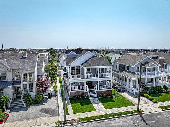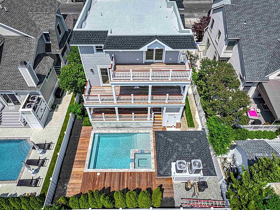 This brand-new home, expertly built by Alexandria Builders, is perfectly situated in the heart of Avalon, just two cross streets away from the beach path. Showcasing a striking blend of coastal elegance and thoughtful design, this expansive home offers exquisite indoor and outdoor entertaining spaces, a southern-facing rear yard, and elevator access to all levels. The low-maintenance exterior features James Hardie siding with PVC painted trim, complemented by five expansive solid Ipe wood decks with blind nail fastening system. Inside, 3,850 square feet of beautifully finished living space includes six large bedrooms, a versatile office/gym/optional 7th bedroom, five custom-tiled full bathrooms, and two half baths. You are greeted with an expansive front entrance solid mahogany door and matching sidelights. Once inside you can’t take your eyes off the white oak onsite finished flooring in a beautiful herringbone pattern with down lighting under the three-quarter height wainscotting. The first-floor family room spans the entire rear of the home, offering an 18’ x 14’ gathering space, a full wet bar with an oversized refrigerator, a powder room, and sliding glass doors leading to a covered rear deck large enough to furnish. This outdoor space overlooks a resort-style backyard, complete with a gunite pool and spa, Ipe decking, and an accessory structure with enclosed storage and an attached cabana equipped with a motorized storm shutter, cabinetry, beverage fridge, stone countertops, and an outlet for a TV. Back inside, the first floor is rounded out with three spacious bedrooms, two full bathrooms, and a large laundry room. Upstairs, the breathtaking second-floor great room features soaring vaulted ceilings above the living and dining areas. The chef’s kitchen is magazine-worthy, with inset custom cabinetry, Wolf and Sub-Zero appliances, stone countertops, and a marble backsplash. The living area is anchored by a sleek linear gas fireplace and includes a undercounter wine/beverage cooler and slider access to the front deck, which is mostly covered —ideal for al fresco lounging. Two junior primary suites at the rear of the second floor each offer en-suite baths with double vanities and private deck access. The third floor hosts a flexible office or gym that could serve as a seventh bedroom, along with a spectacular primary suite featuring a massive walk-in closet with a secondary laundry area, a spa-like bath, and a private sundeck. Additional features include a four-stop elevator, a concrete-grade foundation with ample storage beneath the home and front steps, and carefully curated finishes throughout. All of this is just two cross streets from the beach and a short walk to Avalon’s top dining, shopping, and nightlife—truly a “park-your-car-for-the-weekend” location. If you're searching for a fresh, luxurious take on a custom single-family Avalon home, this extraordinary property delivers. Schedule your private tour today.