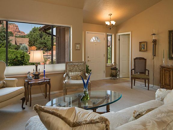 Well maintained 1758 SF home on .47 acre property with mature vegetation, rose garden, grass and spacious enough to add a pool and a guest house. No HOA restrictions on short term rentals. 3BR, 2BA with office, covered back patio with mesa views. Front of home has Red Rock Views! Birds LOVE the green and lush atmosphere. Feed them and they will come singing songs of joy. Stucco exterior with tiled roof; cathedral ceiling in main living area. Sliders off of Dining Room and Master to back trex deck. Remodeled kitchen with tumbled stone splash with accent tile, granite counters, stainless steel appliances, tiled flooring. Office has front view of Red Rocks. Popular split floor plan, gas FP with travertine surround. Corner lot; second owner.