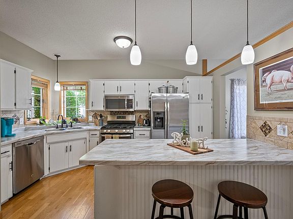 Beautifully updated one-level townhome in Clearwater Estates with 2 bedrooms, 2 baths, and a 2-car garage. Interior updates include new flooring, fresh paint, remodeled baths, and an updated kitchen with painted cabinets, new counters, stainless appliances, and hardwood floors. The bright sunroom opens to a deck with views of flowering shrubs, and a main floor laundry with sink and cabinets adds convenience. The primary suite offers a private ¾ bath, while open living and dining areas provide inviting spaces. Residents enjoy access to the Mississippi River for fishing, trails, and picnics, plus a clubhouse with pool, bocce courts, and year-round activities. Golf cart friendly and minutes to I-94.