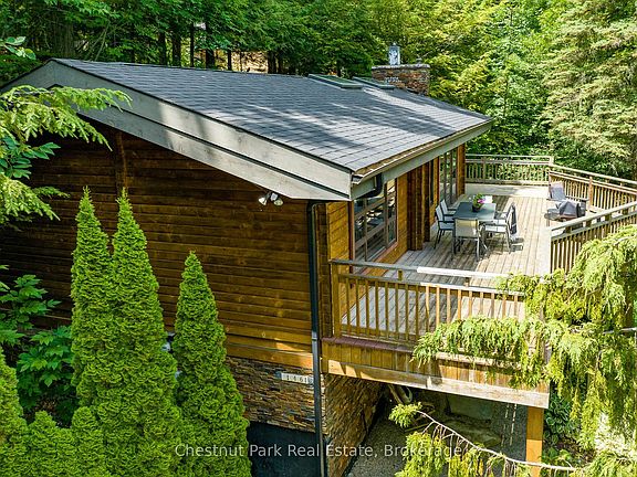 TURN KEY OPPORTUNITY IN CRAIGLEITH. This charming and warm chalet located in the sought after Craigleith nieghbourhood in the Blue Mountains offers year round recreational enjoyment. Move into this fully furnished chalet for thanksgiving. A short walk to Northwinds Beach, minutes to Blue Mountain village, local ski clubs, golfing, and just up the road from the Georgian Trail. The thoughtfully designed 3 bedroom and 2.5 bath chalet is offered FULLY FURNISHED including all housewares (some exclusions). The open concept upper level offers a large gourmet kitchen, living room with stone gas fireplace, vaulted ceilings plus a walkout to the deck overlooking the property. The primary bedroom is just off the main living area offering a 4 piece ensuite. The lower/entry level includes the cozy family room with gas fireplace, 2 bedrooms, and a spa like 4 piece bath with an immaculate sauna. This amazing opportunity awaits you!