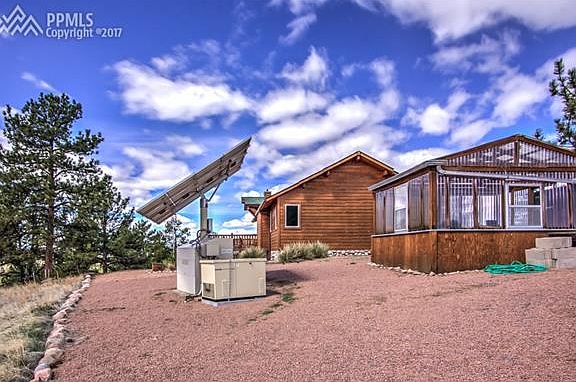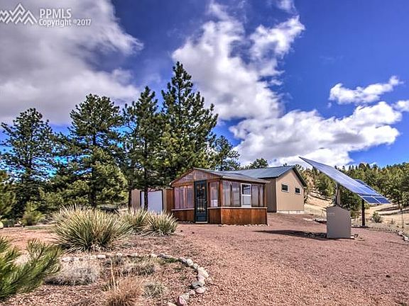 Simply breathtaking views down the valley of Wrights Reservoir and the Sangre de Cristo Range, from this mountain home setting. Cedar sided home located on 4 acres, raised ranch design with many upgrades including; active solar system dual panels w/generator; trex composite decking; 54 yards of concrete driveways; freshly stained exterior cedar siding and rails; fire mitigated xeriscaped perimeter; 10x12 greenhouse; additional large 4 car detached shop and garage with epoxy floors; fresh interior paint; great room, main level living, with open design and pellet stove heating for a cozy climate; amazing Western sunsets on the expansive decks for outdoor entertaining; master bedroom attached to full bath, with walk-in closet; second bedroom on the main level; laundry room located on the main level; lower level family room or exercise area, plus large storage room area; 5+ car garaged parking areas + RV parking; circular driveway for easy in and out access.