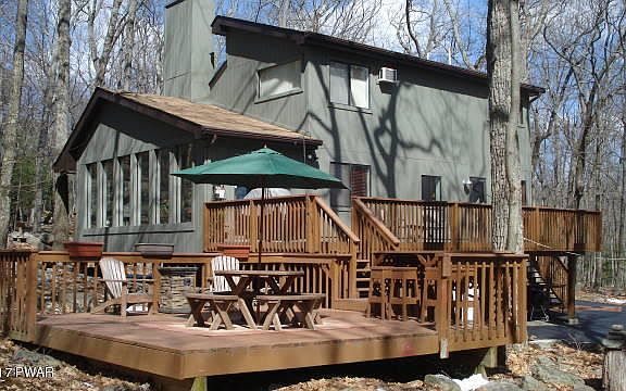 EXCELLENT CONDITION, LIKE NEW CONTEMPORARY HOME ON PRIVATE 1 ACRE OF LAND THAT BACKS UP TO UN-BUILDABLE GREENBELT AREA. HOME FEATURES LOTS OF NATURAL LIGHT FROM LARGE WINDOWS AND LOTS OF SKYLIGHTS. OPEN FLOOR PLAN WITH CATHEDRAL CEILINGS. TWO CAR DETACHED GARAGE WITH WORKSHOP, AND ARTIST STUDIO ON UPPER LEVEL, PLUS ONE CAR GARAGE UNDER HOUSE. 3 BR-2 FULL BATH. FINISHED DAYLIGHT LOWER LEVEL, PAVED DRIVEWAY. CUSTOM KITCHEN WITH MAPLE CABINETS AND CORIAN COUNTER TOPS, HEATED POCONO ROOM, GAS FIREPLACE AND YOU CAN HEAR THE DWARFSKLL CREEK FROM THE BEAUTIFUL DECK. LAKE RIGHTS TO 120 ACRE NATURAL LAKE.