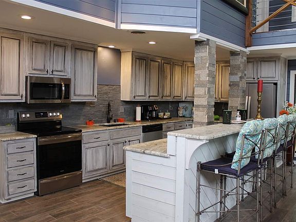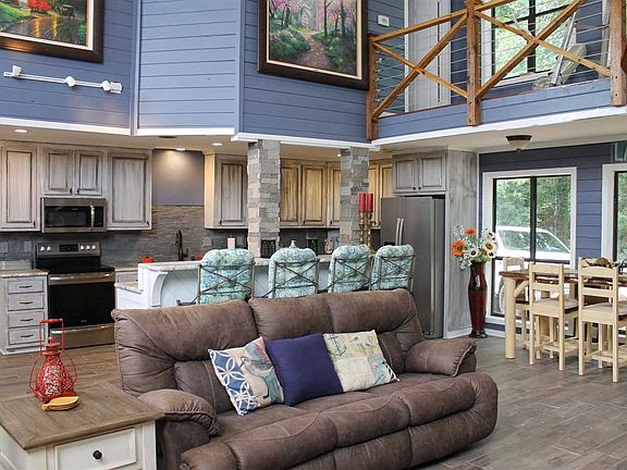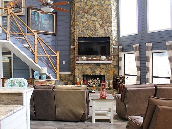 This 4br 3bath water front home is located in The Hills of the Bear on an extremely private lot. The interior has been renovated w/tile floors, granite counter tops, stainless appliances, & stone wood burning fire place. Two master suites upstairs both w/tile showers & soaking tubs in the baths. The lower level has a sitting area, two bedrooms w/ shared bath. The exterior offers screened porch, large deck & private balconies all w/ views of bear creek & just steps to the private stationary dock.