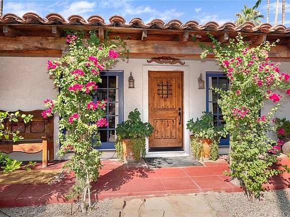 Escape into your private paradise at this classic Spanish hacienda in south Palm Springs' desirable Tahquitz River Estates enclave, where a large homesite and exceptional interior provide style and comfort for residents and guests alike. A beautiful wood gate opens to an enchanting front yard with meandering stone path, a tranquil fountain and a seating area that is ideal for relaxing while taking in panoramic mountain views. Nearly 10,019 square feet, private grounds reveal a covered front porch, a gated driveway, and a fabulous backyard with pool, sun deck, spa, covered patio and lawn. Crowned by an Old World-style barrel-tile roof, the residence was built in 1935 and features hand-troweled interior and exterior plaster, decorative exterior shutters, and solid cedar doors and windows. A total of 3 bedrooms and 3 baths are featured in approx. 1,947 square feet, including an oversized 1-bedroom, 1-bath casita with living room and kitchen. Vaulted open-beam wood ceilings and brick archways are on display in the main home, which showcases wood and Spanish-tile flooring, skylights, a formal dining room, a formal living room with brick fireplace, a great room that opens to the pool, and an upgraded kitchen with solid-surface countertops, custom pine cabinets and stainless steel appliances. This move-in ready home is ideally suited for use as a primary residence, a vacation escape or an income property. There are no HOA fees, and resort hotels, restaurants and shops are nearby.