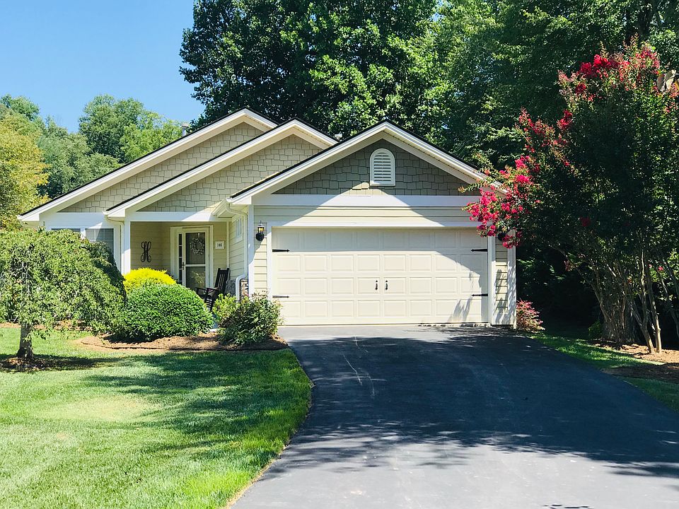 Would you like to live in a perfect location in a beautiful home nestled in a desirable golf community? You can call this completely upgraded villa that has hardwood floors, remodel kitchen and bathrooms, home. You will never tire of the curb appeal and two-car garage or workshop. Prepare meals in a well-appointed, gourmet kitchen featuring granite, water filtration, a Bosch gas range, with a custom built-in pantry. Imagine entertaining friends in this open concept featuring a wall of windows with custom blinds, gas fireplace, and vaulted ceiling. The master suite is spa-like. It features a California walk-in closet, granite and heated tile in bathroom with glass shower. The other two bedrooms are separated by an upgraded full bath. Enjoy the sunrise from a very private covered porch overlooking the largest lot in the subdivision. You see wildlife and gorgeous landscaping maintain with a low HOA fee. Don’t miss this opportunity. Call or text 828.243.9549 to arrange a showing.