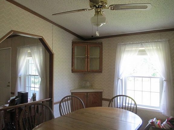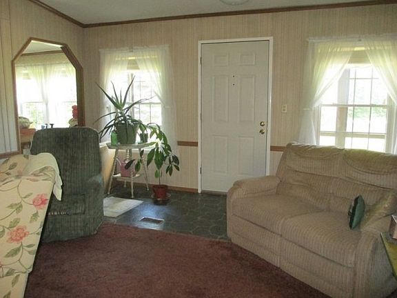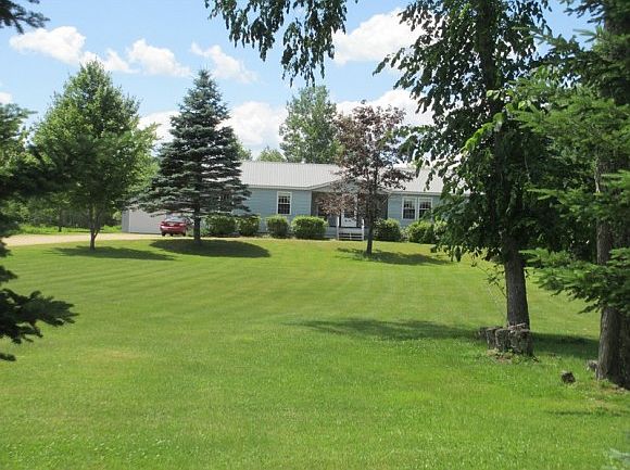 Wonderful dbl wide located on .96 acres, landscaped w/trees, open lawn, sits back from road. 24x48 garage w/6x48' addition. Home has a 45 x 10' enclosed porch w/direct entry to bright,open,3 bedroom home. breakfast bar, woodstove,ceiling fans,laundry room.