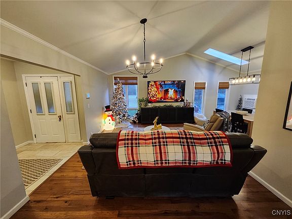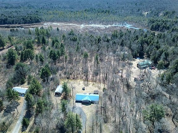 Home for the Holidays! Like new one floor living in this beautifully designed and perfectly updated ranch. Set on 15 acres with frontage on Little River, trees, trails and a pole barn with power, this home has so much to offer. Interior features contemporary open floor plan with vaulted ceilings in main living area (and skylight) plus extra large windows to let lots of natural light in! Beautifully updated kitchen with designer finishes and new stainless fridge and dishwasher plus a porcelain apron sink and white quartz counters with bump out breakfast area and double door pantry. Second family room has wood burning fireplace with blower fan and sliders to back deck with screened gazebo overlooking back woods. Bathroom has also been completely remodeled with beautiful slate black resiliant flooring, new lighting, shiplap wall, fixtures and vanity. Primary bedroom has double closets and access to back deck. Two additional bedrooms are nicely sized with large closets. Bonus home office/den off back of garage and large mudroom area. New whole house water purification system, generator hookup, metal roof and maintenance free siding make this the perfect turn key home you have been searching for! Located just 5 min to Panther Lake, 15 min to Oneida Lake and Sylvan Beach and about 25 min to I-81. *Square footage is different from tax records since it includes add'l 150sqft for heated finished office space behind garage.