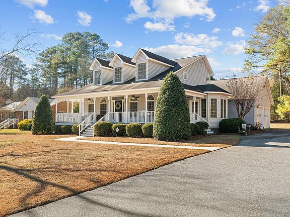 Only steps from Campbell University this home welcomes you with a beautiful wrap around porch great for relaxing! This spacious home offers a formal dining room, office or living room, large family room with fireplace and gas logs, kitchen with center island, breakfast area, and laundry room with a sink. The primary suite is on the main floor and has a walk-in closet, large bath with double vanities, separate shower and jetted tub. The upper level offers 2 bedrooms, ample closet space, 2 additional flex rooms and a full bath with double vanities. Spacious lot with patio for entertaining and an oversized garage. Hurry this one will not last!