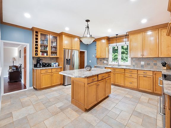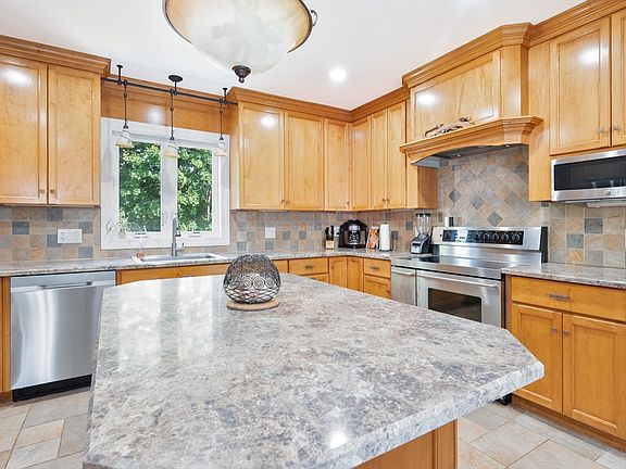 The gourmet kitchen offers custom-cut maple cabinets, a center island, a double oven with a hood vent, and a tiled backsplash. New upgrades since 2008 include a dormered 2nd story, roof, siding, newer windows, hardwood floors, an upstairs bath, and crown moldings throughout every room. The basement features a bonus room, offering potential for a third bedroom.