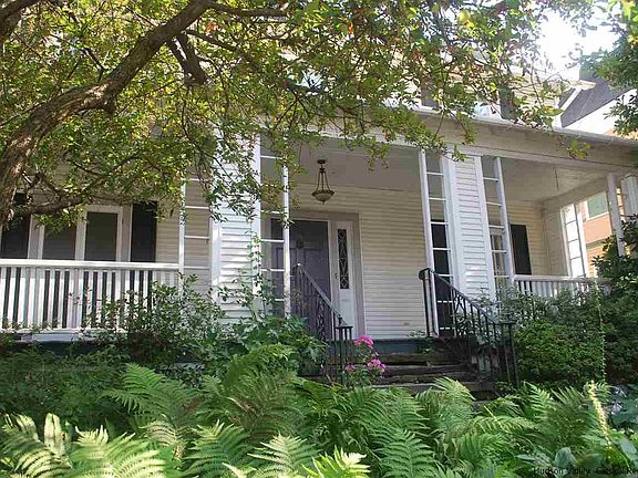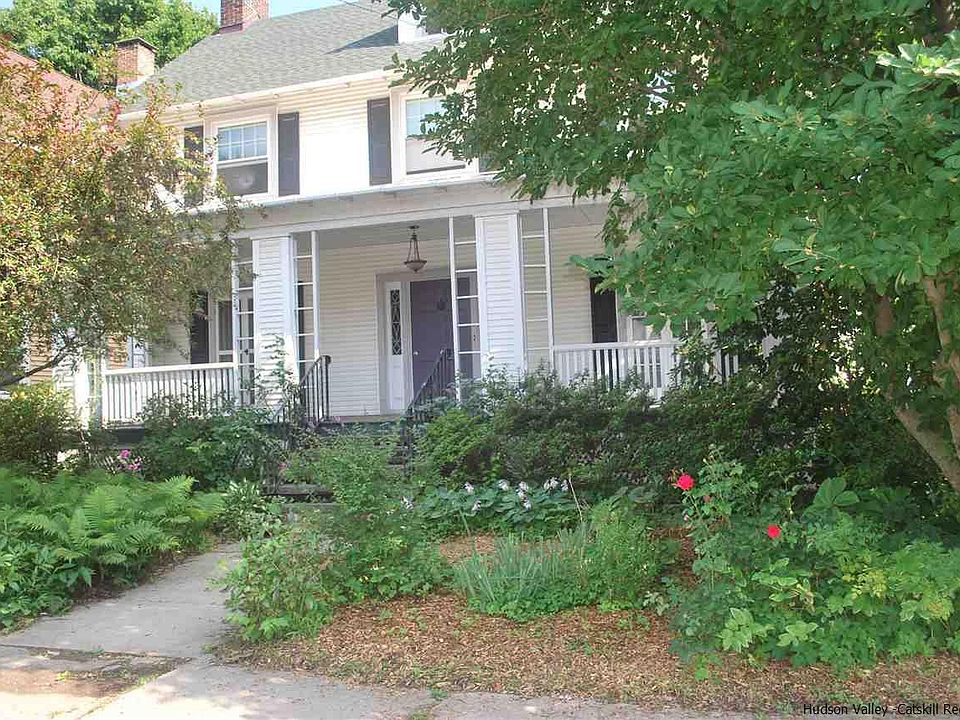 This beautiful colonial in historic uptown Kingston has it all! Enter this classic home via a lushly landscaped front garden and up the vintage stone steps. A gracious rocking chair front porch that graces the entire width of the house is perfect for enjoying morning coffee or the evening breeze with the privacy of mature plantings surrounding it. A classic entryway and ample foyer bring you through to an elegant, large living room with stunning period brick hearth. A classic paneled den behind the living room overlooks the spacious backyard, making it a perfect place for a home office or library. The first floor also features a beautiful, bright dining room with cozy window seat that can easily seat 12 for dinner or any occasion. Both living and dining room have original French doors that open on to the front porch making for an open, airy flow reminiscent of earlier times. An ample kitchen with large windows overlooking the backyard welcomes morning sun for a perfect breakfast space. Contemporary glass cabinetry, new appliances and a spacious, walk -in pantry and half bath compliment the classic layout. The unique stairs with vintage details and bright sun-filled landing bring you to four spacious bedrooms. Each bedroom has generous closet space. There are two full baths including one in the master bedroom. A secret walk-out private balcony nestled between the two back bedrooms has views of the backyard and tree-filled surrounding neighborhood. The walk-up third floor is the perfect space for easy access to storage. The deep lot with ample fenced backyard has plenty of room for gardens, patios or deck and pool. The oversized, detached, two-car garage has extra storage and brand new doors. Recent updates include central air, kitchen cabinets and new appliances. The recent roof and vinyl siding make upkeep easy. Original hardwood floors, up-to-date windows and period details throughout. Huge basement also provides ample storage or expansion opportunities. Walk to everything in desirable uptown Kingston including shops, restaurants, farmers market and NYC bus, This wonderful home is waiting for its next owner! 146 Main Street awaits!