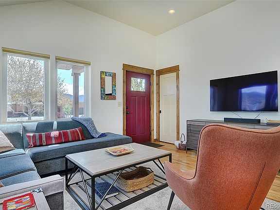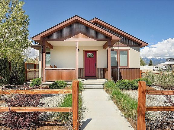 Beautiful bungalow in Crestone Mesa! Designed and built by Natural Habitats, this light-filled home makes efficient use of space, living larger than its footprint. Living area has vaulted ceiling and flows to the kitchen which features a generous pantry, breakfast bar, quartz counters, and brand new fridge. Beautiful hardwood floors throughout home; tile in bathroom. Covered front porch and patio out back. Mature xeriscaping is lovely and easy to maintain. The single-car detached garage is ready for your electric vehicle and bikes. There is more parking available next to the garage. This home has $0 electric bills thanks to the photovoltaic system! Crestone Mesa is an established neighborhood based on time-honored principles of traditional livability, welcoming front porches, character of design, variability in size, style and materials, rear garages accessed from shared alleyways and a large central park with places to play, garden and gather. Just west of Salida Golf Course, walk or bike the adjacent trail a short distance to downtown Salida and Franz Lake.