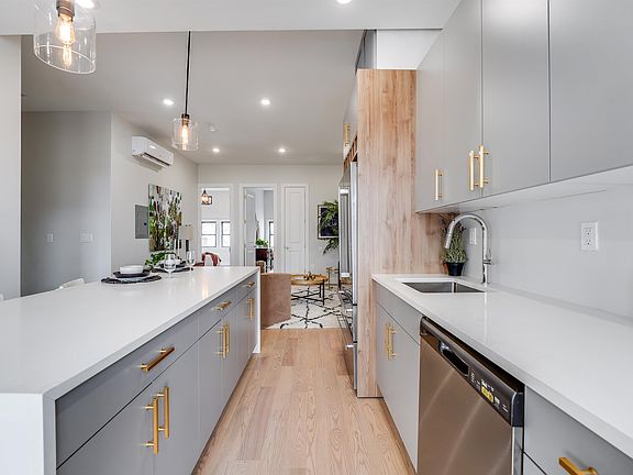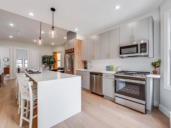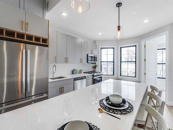 Redefine modern comfort and convenience with this newly renovated, two-story home in the Western Slope neighborhood of Jersey City Heights. First impressions are everything with fresh siding, elegant brick accents, and Dutch colonial architecture. Industrial chic design echos throughout the interior with bright white oak flooring, white crown molding and black window trim, and all the modern conveniences. Beautiful bay windows offer extra natural light, plus super spacious open concept living. In this upstairs unit, owners enjoy high ceilings, plus a two bedroom, den and three full bath layout. Featuring not one, but two private outdoor spaces, indulge in the private terrace off the living room and the secluded roofdeck for skyline city views. The contemporary kitchen hosts a spacious eat-in island with white waterfall quartz countertops. Finishes include modern gray cabinets including custom touches like wine storage over the refrigerator, brass fixtures and stainless appliances. Bathrooms offer style with beautiful porcelain tile, spacious vanities, bathtub and shower combos and continued brass fixtures. This home is nestled in the peaceful neighborhood of Western Slope in The Heights, walking distance to Washington Park, 9th Street Lightrail and Hoboken, Central Avenue and more. The Heights is known for its vibrant community, great shops, restaurants and cafes, excellent schools and easy NYC access.