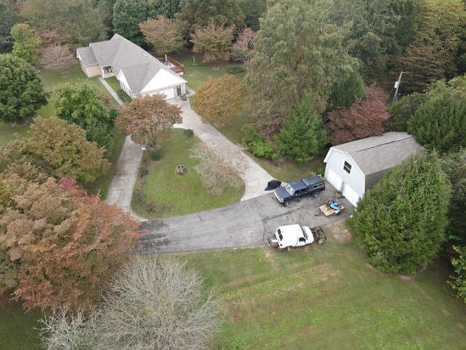 This home was hand built by the seller's husband, hardwood floors, geothermal heating, large wooden deck overlooks a picturesque back yard, plenty of trees, crepe myrtles, bird houses. Level ground for easy maintence. The house has a true 2 car garage, AND there is an additional detached garage, with the capability of an apartment above it. Blacktop drive way leads to a circle drive in front of the house and garage, lots of parking space. CLOSE TO THE LAKE!!
