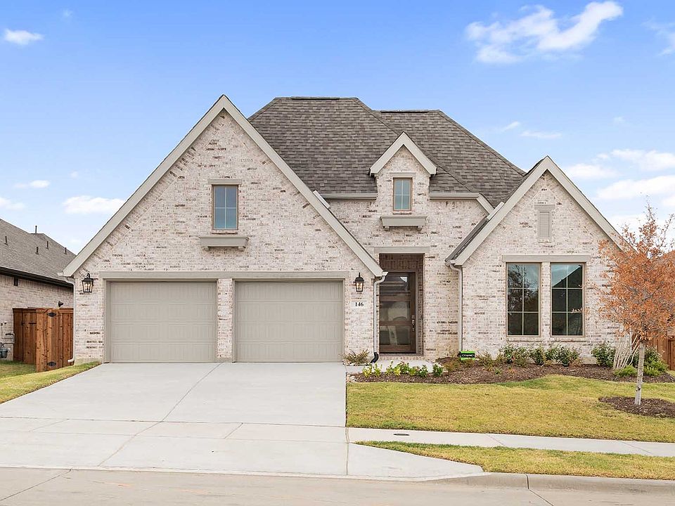 Extended entryway with 12-foot ceilings. Game room with French doors frame the entry. Spacious family room with a wood mantel fireplace and wall of windows. Open kitchen offers an island with built-in seating space and a corner walk-in pantry. Primary suite with a wall of windows. Dual vanities, garden tub, separate glass enclosed shower and two walk-in closets in the primary bath. Guest suite just off the extended entry with a full bathroom and walk-in closet. Secondary bedrooms with walk-in closets. Utility room with private access to the primary bathroom. Covered backyard patio. Mud room just off the two-car garage.