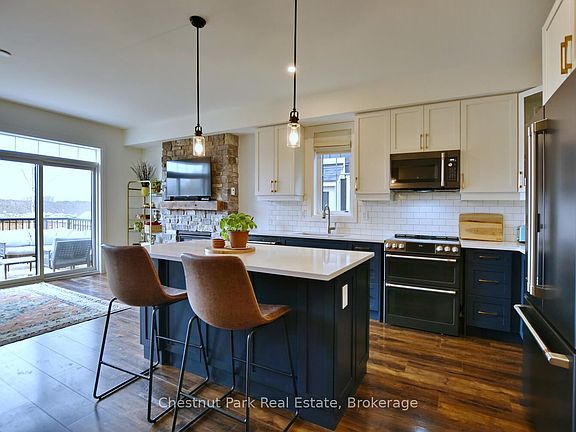Welcome to 146 RED PINE located in the sought after community of Windfall. Move in this Ski Season. This semi detached 3-bedroom 4 bath home. Main level Open Concept with discerning finishes including, upgraded kitchen & bath cabinets & hardware, Quartz counter tops, throughout, design forward *Cafe appliances, pot lights, added ambiance on those cool winter nights from the natural gas-fireplace-upgraded ceiling to floor stone work, and carpet free with wide plank engineered flooring for minimum maintenance top to bottom. An "Open to Below" builder upgrade, provides a bright and airy feeling when accessing the fully finished theatre style lower level this level has its own designer glass shower and 3-piece bath Unwind in the Primary Suite featuring, custom window coverings walk in closet. The ensuite offers a stand-alone tub, spacious-designer glass shower, Quartz counter tops & more. Bedroom level laundry room with upgraded cabinets & Laundry tub and Samsung washer and dryer. Spectacular mountain view sunsets & fabulous sunrises, from the room sized-two-tiered deck with existing electric hook up rough in for hot tub & yes, a gas-hook up for the barbecue in a fully fenced yard. Single car garage with loft storage and 2 additional driveway space. Steps from your front door is a nature trail connecting to neighbors such as, Scandinavia Spa or Blue Mountain Resort (walking distance) & many great venues. On Site amenities include "The Shed" A Four-season part Club House, part Recreation Centre /Gym/Hot Tubs/Pools/ Sauna/Fireplaces/Patio/Exclusive for Home Owners!