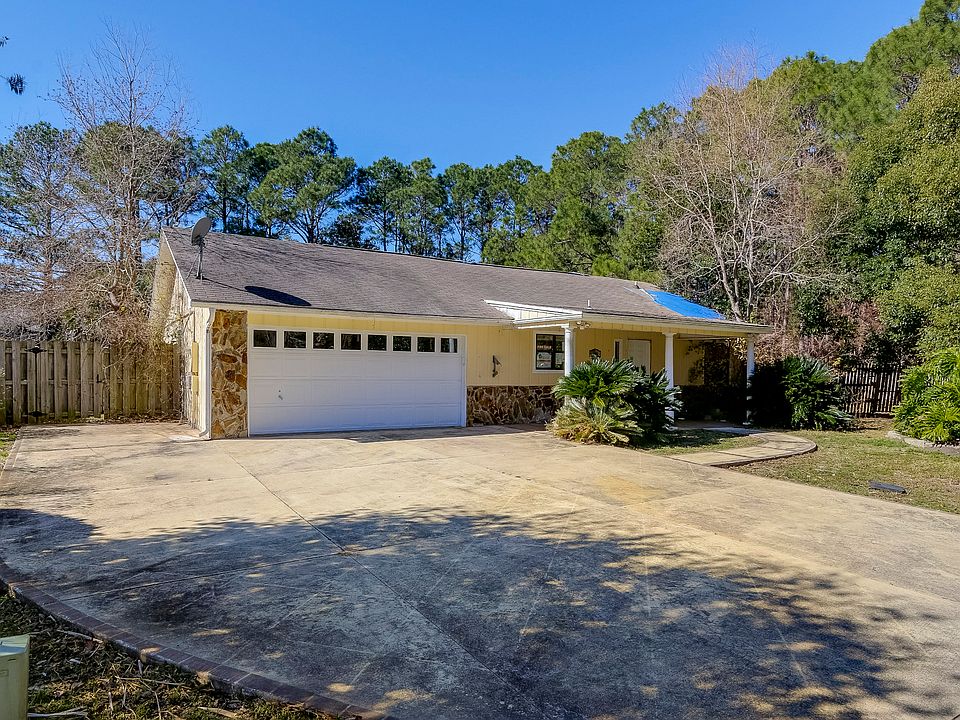 One mile to the beaches or enjoy your private in-ground pool! Three bedroom, two bath pool home, surrounded by lush landscaping and wooded areas on two sides for shade and privacy. Open concept floor plan has vaulted ceilings, fireplace and recently updated kitchen with granite counters and plenty of storage space. Two car garage and ample driveway space for additional parking.