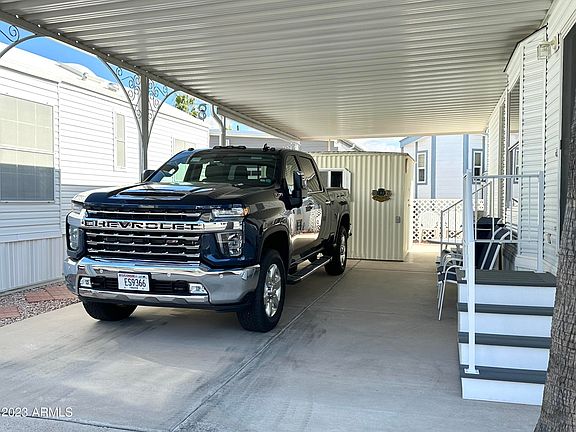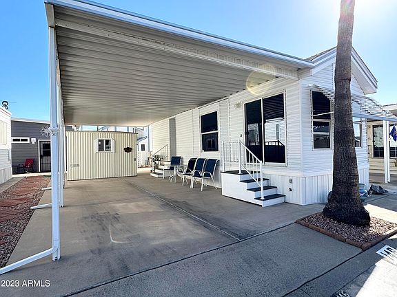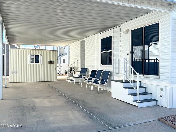 LOVELY 1998 CAVCO, located just a short walk from our EXPANSIVE CLUBHOUSE! FANTASTIC 55+ RESORT where you OWN THE LAND....OWN THE FUN! LARGE CARPORT gives AMPLE room for parking & space to enjoy the outdoors! GREAT additional back patio perfect for BBQing your favorites! METICULOUSLY MAINTAINED! INVITING floorplan offering U-shaped kitchen w/ considerable amount of cooking counter space & GREAT kitchen Pantry for all your storage needs. RO SYSTEM for fresh drinking water, NEWER REFRIDGERATOR & loads of QUALITY CABINETRY! 2 NEWER rocker RECLINERS & SOFA SLEEPER make it ideal for guests! Tub/shower combo in bathroom & nice vanity counter space. Inviting cozy bedroom w/ queen size bed for a perfect nights sleep. LARGE MIRRORED CLOSET and BUILT IN DRESSER AREA! PLENTY of room for all your clothing storage needs. TINTED WINDOWS & NEW ROOF IN 2022! SET ON FULL CONCRETE SLAB. LARGE STORAGE SHED provides great area for hobbies along w/ stackable washer/dryer and EXTRA refrigerator! NEWER outdoor TREX ENTRY STEPS that won't weather! COME enjoy the AZ sunshine with us in this WELL LOVED home!