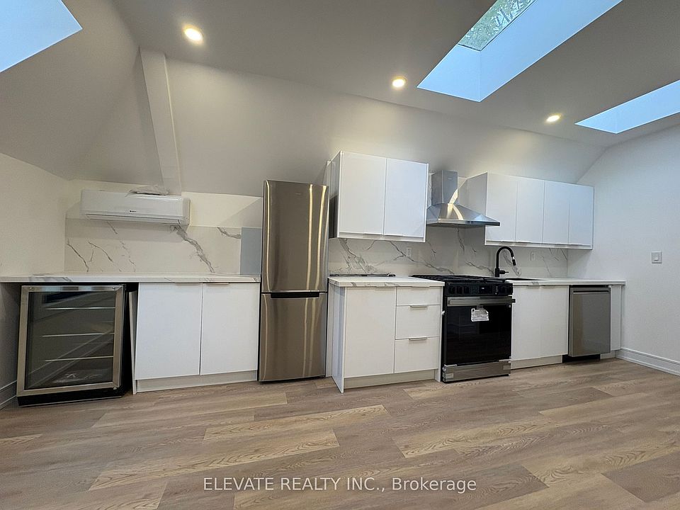Filled with natural lightVaulted ceilingsMultiple skylightsAiry open-concept layoutContemporary kitchenStainless steel appliancesBuilt-in wine fridge