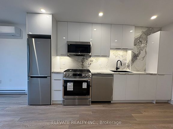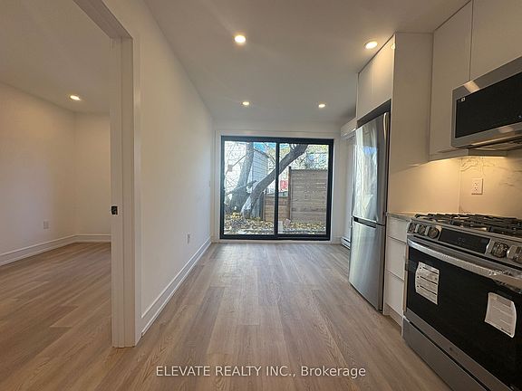 Discover contemporary comfort in this newly built main-floor garden suite, privately situated in a quiet backyard setting. Thoughtfully designed with bright, open living spaces and modern finishes throughout, this residence offers the feel of a standalone home with exceptional privacy. The spacious open-concept living and kitchen area is highlighted by floor-to-ceiling sliding doors that overlook a private yard, creating a seamless connection between indoor and outdoor living. The sleek modern kitchen features high-gloss cabinetry, full-size stainless steel appliances, a gas range, quartz countertops, and a marble-style backsplash. One bedroom offers a large window and excellent natural light. The contemporary four-piece bathroom includes a rainfall shower and stylish finishes. Additional conveniences include in-suite laundry with a brand-new stacked washer and dryer, efficient heating and cooling with split AC units, wide-plank flooring, and pot lighting throughout. Situated in a friendly residential pocket near St. Johns and Runnymede, this home provides easy access to transit, shops, parks, schools, and local amenities-offering an ideal balance of quiet living and everyday convenience. A rare opportunity to enjoy a beautifully finished, private garden suite in a highly sought-after west-end location.