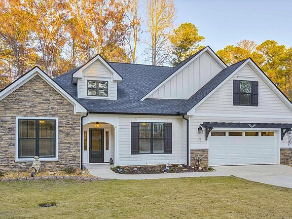 Absolutely stunning LAKE VIEW home in the desirable neighborhood of Savannah Lakes Village! The popular Flowering Peach Plan built by Capital Builders, including many upgrades, this 4 BR, 3 BA home sits on a level lot and offers a large, screened-porch overlooking exquisite landscaping, 8 inches of River Rock border the entire home. The well-crafted fire pit just off the back patio is surrounded by Lake Thurmond pebble rock and lush Zoysia grass. The interior of the home offers engineered hardwood floors throughout entire main level, farmhouse trim work and molding and custom cut 2-inch blinds on all windows. Kitchen features granite counters, glass tile backsplash, Maytag stainless steel appliances, farmhouse sink, two-toned, soft close cabinets, upgraded flat-top island and walk-in pantry. Spacious Living room with coffered ceiling, large windows open to screened porch allowing for an abundance of natural light to flow through the home. Primary bedroom offers trey ceiling and walk-in closet with custom built shelving. Chic primary bathroom with doorless walk-in shower, tiled shower bed, floor to ceiling tiled walls and sitting bench, double sink vanity with exquisite quartz counter, and ceramic tile flooring. Bedrooms 2 and 3 on main level separated from primary bedroom. 4th bedroom on upper level includes private bathroom with walk-in shower and granite counter. Large laundry room with storage closet and built-in cabinets. Mud room with built-in bench and cubbies. Oversized 2 car garage offers additional space to park a golf cart. Additional features include sprinkler system front and back, 3 walk-in attic storage areas, radiant barrier insulation in attic, and gutters with leaf-guard system. Just behind the house is a walking path that leads to the community dock. Life's better at the lake!!!