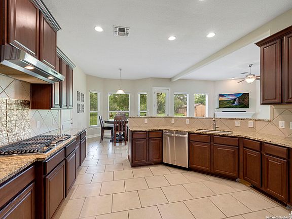 Welcome to this serene home located in a gated community of Castroville, where comfort and thoughtful design come together in a peaceful setting. A blend of warm-toned brick and crisp white stone creates a welcoming exterior, complemented by elegant landscaping. The driveway leads to a two-car garage, offering both convenience and curb appeal as you arrive. Inside, a tall, glass-inset front door opens into a bright and airy foyer filled with natural light. The entryway features high ceilings, soft neutral tones, and arched transitions that contribute to the open and calming atmosphere. Tile flooring extends throughout the main living spaces, guiding you effortlessly into the central areas of the home. The open-concept kitchen is designed with both function and style in mind, making it a natural gathering spot for everyday living or entertaining. Granite countertops, cabinetry with crown molding, a 5-burner gas cooktop, and a decorative metallic backsplash combine to create a space that is both beautiful and practical. The adjacent breakfast nook is surrounded by windows that invite in natural light and offer a peaceful view of the private backyard. From the kitchen, the layout flows directly into a spacious living room centered around a cozy fireplace. The open arrangement allows for easy interaction, whether you're hosting visitors or enjoying a quiet evening at home. The primary suite provides a private and relaxing retreat, a ceiling fan, and a generously sized en-suite bath. The bathroom includes a soaking tub, separate shower, dual vanities, and a walk-in closet, all designed with comfort in mind. Additional bedrooms offer ample space and convenient access to full bathrooms, making them suitable for a variety of household needs. Upstairs, a large bonus room offers flexible space that can accommodate a home office, media room, or creative area. A built-in workstation nestled into an arched niche adds functionality while maintaining the home's thoughtful architectural details. Out back, a covered patio overlooks a tree-filled yard, offering a peaceful outdoor escape. With ceiling fans and a built-in grilling area, this space is ideal for casual outdoor dining or simply enjoying the surroundings. Located in a gated neighborhood, this home combines privacy, comfort, and quality design. Beautiful home for plenty of outdoor activities with room to grow. Come take a look and start your next chapter!