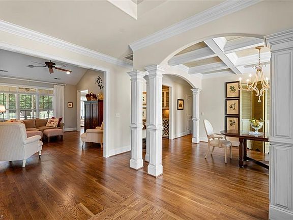 Beyond fabulous home in Bermuda Run West! Beautifully maintained & updated-lovely HW flrs & detailed moldings-warm & inviting entry leads to spacious DR with coffered ceiling-vaulted ceiling, built ins & gas log FP in expansive LR-gorgeous kit with custom cabinetry, solid surface countertops, subway tile, cabinet lighting, pantry, SS appl, bfast bar & butlers pantry including sink & wine rack-oversized bfast/keeping rm-split bdrm design-large primary suite features detailed tray ceiling with cove lighting-luxury primary bath offers oversized jetted tub, sep sh, dbl vanities and an amazing walk in closet with tons of shelving-huge walk thru laundry rm with utility sink & closet-UL features lg bonus rm, full bath & sep office/craft space with abundant shelving & huge closet-screened porch opens to pavered patio & overlooks the golf course-fenced yard-beautifully landscaped-encapsulated crawl sp-new LVP flring UL-recent water heater & window screens-don't miss this gorgeous home! HSA warr