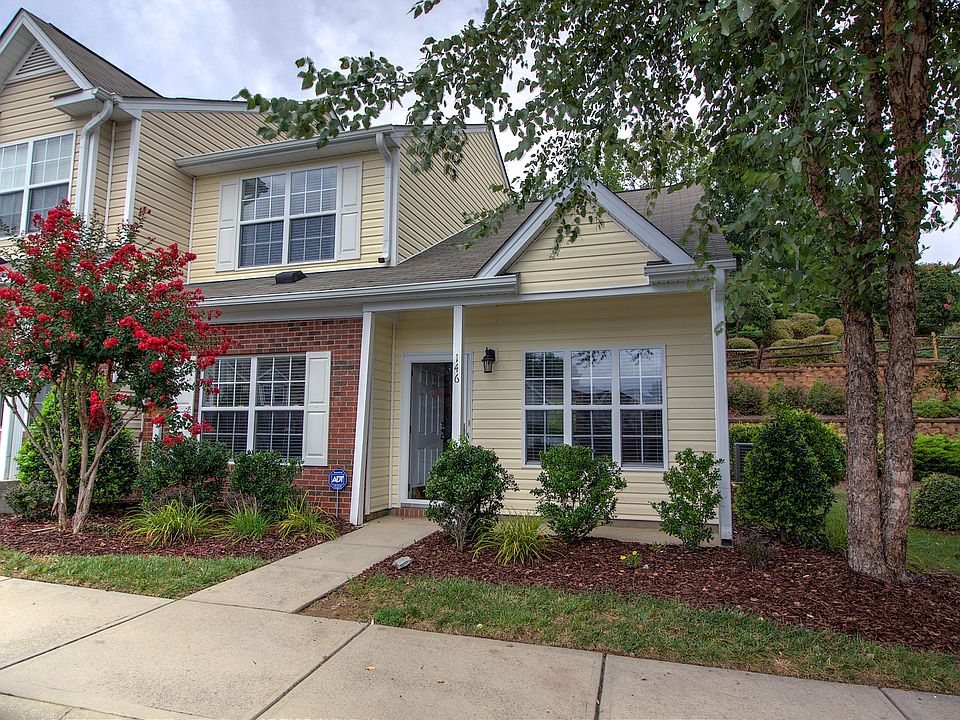 Beautiful end unit shows like new! Features incl laminate hardwd flring in LR, ceramic tile in kit & half BA. Gas firepl, vaulted clngs & more! Keyless entry, master on main, 3 bed, 2.5 bath, stove, microwave, dishwasher. Patio, community pool. Great location in 27410 near shopping, schools, downtown, airport - must see this one!