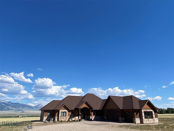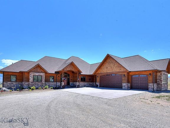 BACK ON MARKET! (was contingent on sale of buyer's home in a timeframe) Breathtaking custom home upgraded throughout. This immaculate split plan 3bd 3.5ba home offers private bath for each bedroom and a 4th non-conforming bedroom. The quant entry-way with stone accents & stamped concrete leads you into a great room with impressive gas fireplace & picture windows that frame Sphinx Mountain & Madison Range. Host family & friends in the chef's kitchen with center island, prep sink, gas stove, walk in pantry & upgraded appliances. Luxurious master suite with large bathroom & features electric upper shades. Surround sound with an outdoor feature. Mature trees watered through a drip system line the driveway leading to the 3 car attached garage and the large detached RV garage & adl' finished, heated work shop. 35 gpm well. Take a walk on this 20 acre estate to the pond located on the north side of the property. Build a gazebo or fire pit to extend the enjoyment and wildlife. Elec dog fence!