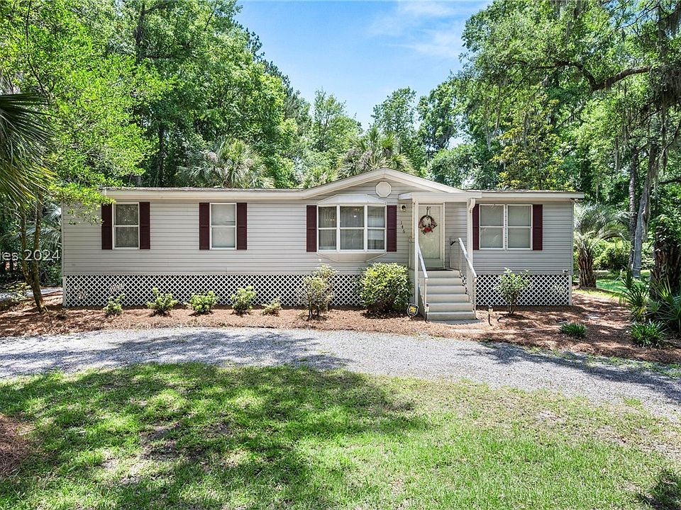 Great opportunity for ownership close to Old Town Bluffton. .66 acre lot, 1998 Mobile home has 3 bedrooms with 2 baths in excellent shape, 2 car carport with storage shed on site. Road access on front and rear of property. Currently on septic and sewer is available.
