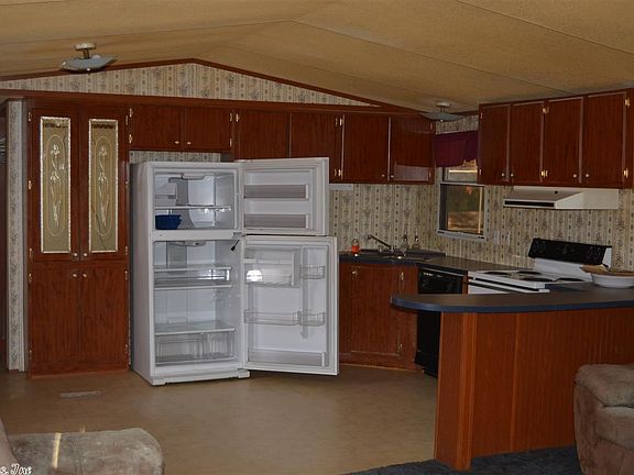 Home on Lake Conway. It sits on 1 acre and has a beautiful view of the lake. Fenced, lots of tall trees and privacy, this would be a wonderful weekend retreat or full time residence. This mobile home has 3 bedrooms, 2 baths and an open floor plan. Lots of lake frontage for boating or fishing. Property has a boat dock that was flipped over during storm but could be fixed. Washer, dryer and refrigerator convey with property. There are 2 storage buildings on property.