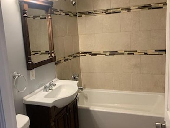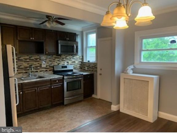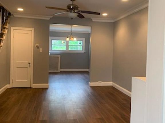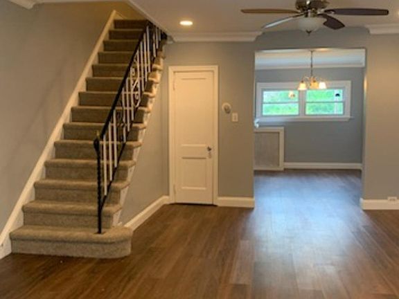 Total Rehab. Beautiful 3 bedroom 1 full bath renovated row in mint condition. Enter to living room with new laminate flooring; dining room and entrance to the updated kitchen. Newer appliances in the kitchen- stove; microwave and dishwasher. Exit door to back yard . Upper level has a front main bedroom with large closet space and newer designer ceiling fan/light fixture; newer 3 piece hall bath and two more bedrooms. All new carpets in the bedrooms. Basement has a laundry area; access door to yard. . Walk a block to Shopping District. This one won't last.