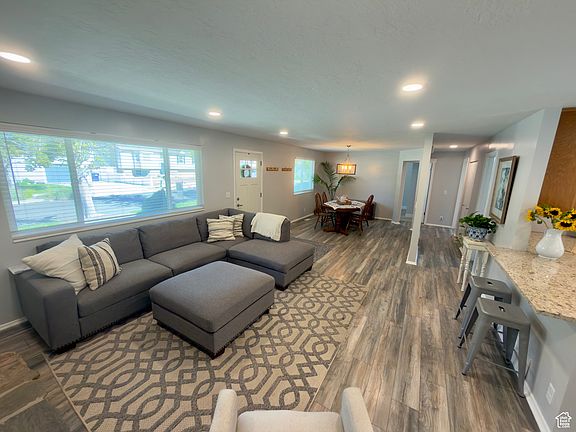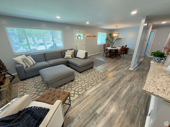 Absolutely stunning remodel! Kitchen remodeled with new granite counters, new backsplash, all new appliances (included). Brand new HVAC system, new carpet throughout, new paint, new windows, new roof 3 years ago, remodeled bathrooms, new garage door, new high-end hardy board siding, shutters, can lighting, light fixtures, molding, updated electrical, new Kentucky Blue grass, new gutters, new deck, partial new vinyl fence, etc, etc! Gorgeous home with a very open floor plan on a large corner lot in a very quiet and secluded neighborhood. Excellent & highly sought after area of Sandy. Huge garden & fruit trees (cherry, pear, peach, grapes). Wood burning stove. Huge storage room in basement. All main floor living. Close to shopping, Falcon Park, schools, churches & 6-7 minutes to I-15. Near Snowbird & Alta ski resorts. 5th bedroom was converted into a large dining room; could easily be converted back to a bedroom if needed. Won't last long! Agent related to seller. Sqft per county records, buyer to verify all info.