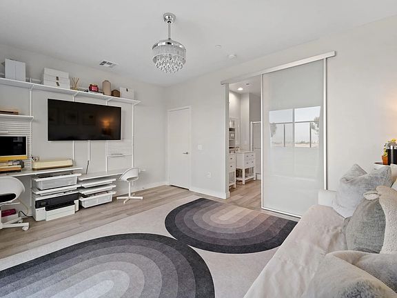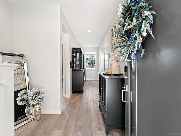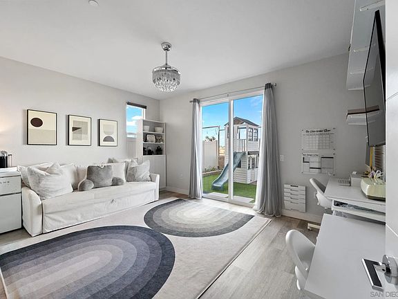 Discover the perfect blend of style and convenience. This beautifully upgraded 4-bedroom, 3.5-bathroom home features luxury vinyl flooring throughout, a stunning kitchen with Calacatta gold quartz countertops, and upgraded Samsung black stainless appliances. The kitchen also opens to a spacious balcony, perfect for enjoying the outdoors. The owner's suite includes an upgraded ensuite with porcelain tile flooring and backsplash as well as quartz counter tops and a walk-in closet. The downstairs bedroom offers upgraded vanities, creating a flexible dual owner suite option with walk-in closet. The west-facing backyard is fully turfed and offers privacy with no rear neighbors, ideal for relaxing and enjoying the sunset. Additional features include motorized window coverings in kitchen, shutters throughout living and dining area, a 25-panel leased solar system, 2 EV charging plugs in the 2-car garage, and upper storage racks for added functionality. Plus, you're just a short walk from Otay Ranch Town Center, offering easy access to shopping, dining, and entertainment.