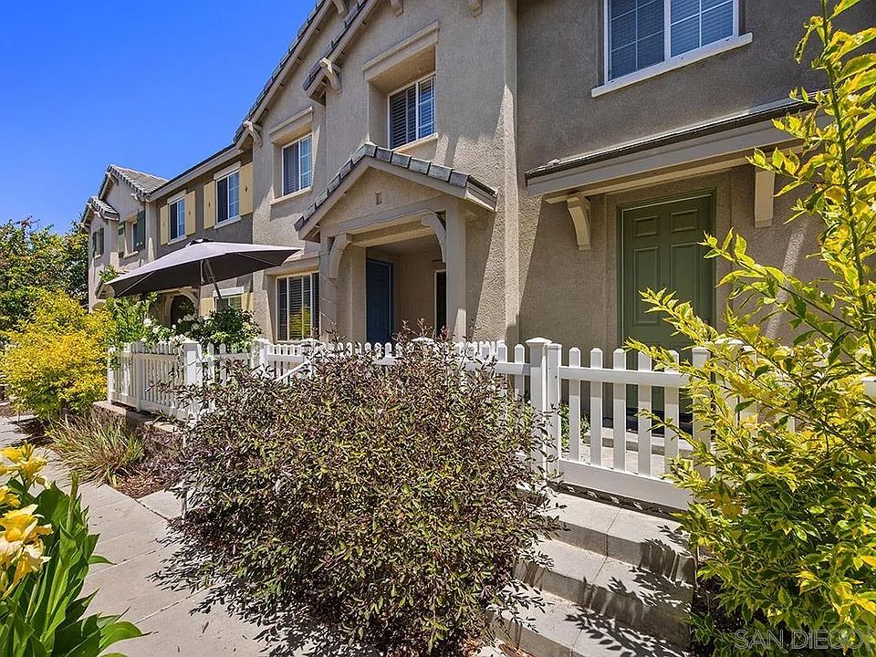 Upgraded corner-unit townhome with 3 bedrooms and 2.5 baths at Monet in Otay Ranch. Fall in love with the front porch/patio area complete with a charming white picket fence! This popular floor plan boasts high ceilings, vinyl plank flooring, and updated lighting fixtures. The large open-concept kitchen features stainless appliances including gas stove, recessed lighting, and plenty of counter space. Primary bedroom features a walk-in closet and ensuite bathroom with dual vanity. Other notable details include a downstairs powder room, plenty of storage, and an attached two-garage with washer/dryer. FHA and VA approved!