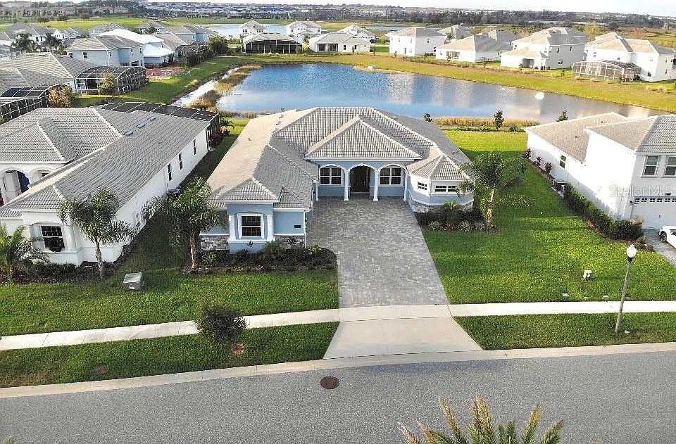 WATER VIEW HOME!!! Welcome to ChampionsGate! This almost new home is in perfect condition and ready for you! Located in the gated Estate section and backing up to a beautiful POND VIEW! This 4 bedroom 3 bath with an office is loaded with upgrades! The long paver driveway leads up to your 3 car garage side entry garage and covered front entry and into this stunning home with crown molding. Decorative columns allow a spacious and open feel to the formal dining room and the living room provides sliding glass door access to the patio. This energy efficient home features 42" cabinetry, quartz countertops, stainless steel appliances, including a GE Profile refrigerator, a custom subway tiled backsplash, and an oversized breakfast bar with pendant lighting. The kitchen overlooks the family room and dinette space. The huge primary bedroom boasts trey ceilings and crown molding complemented by double walk-in closets, an enormous en-suite bath with separate quartz vanities, soaking tub, and walk-in Roman shower with dual shower heads. The three way split plan features two bedrooms which share a full bath and a fourth bedroom which would make a perfect guest suite with a full bath with glass enclosed shower. The utility room leads you to the garage with plenty of storage space. There are many smart upgrades including a Ring camera doorbell, a Schlage keyless entry smart lock, a smart alarm with motion sensors, a smart thermostat, smart lights and motion sensor lights in several areas of the house, and wifi enabled garage door openers. You will also find an energy efficient hybrid water heater, special dimmer switches in all bedrooms that control the fan and lights, and a Ruckus expansion system port extender for better wifi coverage.Enjoy the resort style Living that Champions Gate offers pool, spa, tennis, basketball, golf, fitness center, on site concierge, and much more. Amenities include: Lazy River, Water-slides, Swim-Up Bar, Water Falls, Beach Entry, Spa, Splash Pad, Grill, Bar, Fitness Area, Theatre, Game Room, Tiki Bar and Cabanas. Simply relax by the pool, watch your family have a great time. All of these amenities, plus seven tennis courts, and cable/internet, lawn care, Trash pickup, Bulk Pick up, Yard waste pickup, and recycle pickup are INCLUDED in HOA. Champions Gate is a highly sought after community, perfectly located close to major highways, 15 minutes to Disney, Orlando attractions, restaurants and stores. Schedule your Private Tour Today.https://youtu.be/HDphi9X1daI