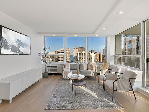 Welcome home to this stunning, BRAND NEW renovated 2 bedroom/2 bathroom PLUS DEN corner unit in the Alcott House of Sandburg Village. With a private outdoor balcony and sun-drenched Southeast-facing views of the Chicago skyline and Lake Michigan from the 20th floor, this space is the perfect oasis. This beautifully crafted unit boasts new recessed lighting throughout, smart light switches, stylish engineered hardwood floors, new plumbing and electrical, and ample organized storage. The open concept living and dining area offers ample space to entertain guests while enjoying beautiful views of the lake and skyline. The chef's kitchen is equipped with high-end stainless steel smart appliances, under-cabinet LED lighting, quartz countertops with island seating, as well as newly added recessed lighting and pendants. The primary bathroom is a true luxury with a full body spray shower, recessed medicine cabinet, beautiful vanity and custom tile work. The enormous primary bedroom is complete with modern light fixtures, professionally organized storage, and even space for a WFH set up. The perfectly situated second bedroom with lake view easily fits a queen mattress and is extremely comfortable with tons of closet space and recessed lighting throughout. The 2nd bathroom is both convenient and beautiful with a deep Kohler soaking tub and beautiful tilework. The den offers versatile options such as an office, nursery, guest bedroom or storage space. The Alcott House is extremely well-maintained and features on-site management and maintenance, strong reserves, and modernized elevators, updated hallways, and so much more. The sun deck offers stunning panoramic city views. Monthly assessments cover heat, TV cable, internet, 24/7 door staff, rooftop sun deck, and storage locker (everything except electric). Leased heated garage parking is additional $170 a month. As a resident of Sandburg Village, you'll enjoy access to two outdoor pools/sundecks for a small seasonal fee, tennis courts, hospitality rooms, and beautifully landscaped courtyards. The prime location is just one block from the train, bus stops, and Potash Market. Easy access to Lincoln Park, Lake Michigan, the beach, Lake Shore Drive, and all the amazing restaurants, bars, and shopping that Old Town and the Gold Coast have to offer. Pets are welcome!