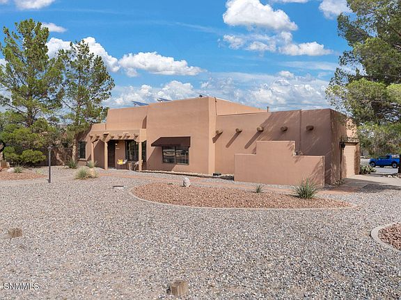 Pueblo Revival Charm with Custom Southwest Details. Step into timeless Southwest living in this beautifully crafted home, blending warmth, tradition, and custom detail throughout. Situated on a .24-acre corner lot, this well-maintained 1,906 SqFt home offers 3 bedrooms & 1.75 bathrooms. As you enter, the open floor plan, soaring wood ceilings, and abundance of windows & skylights provide a bright & expansive feel. Enjoy the wood-burning kiva fireplace from the dining & living rooms or continue out to the east facing patio & take in the Mountain View's. The dining room flows into the kitchen, which offers updated granite countertops & stainless-steel appliances, while keeping the rustic finishes like Talavera tile on the backsplash, a wood ceiling with exposed vigas, & hand carved corbels. The laundry room is off the kitchen and boasts wood cabinets, granite countertop, and washer/dryer. The Primary Suite is truly a retreat, with fireplace, sliding glass door to patio, & updated bathroom.