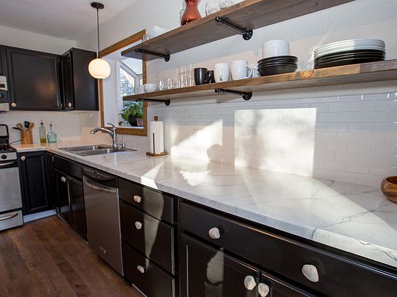This stunning, remodeled home has an open floor plan w/ natural light, in floor heat & gas stove fireplace to keep you warm. Kitchen features SS appliances, gas range, bay window & large island. New paint, flooring, hardware and fixtures installed. Newer HWH, boiler & long lasting metal roof. Extensive landscaping & fully fenced yard with dog run, shed & playhouse. See attached list of upgrades