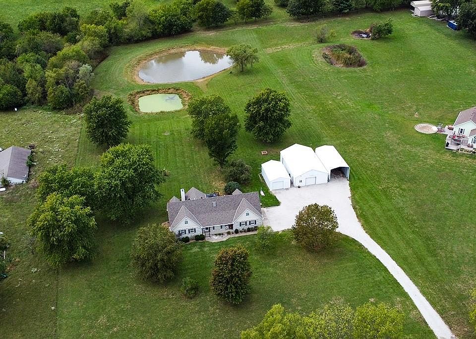 Don't Miss out on this Absolutely Beautiful home Inside/Out! Your opportunity for a peaceful and serene country living is finally here!! 4 Level acres with pond, Stunning home, Luscious landscaping, Large 30' x 48' workshop with 2 overhead doors & loading dock, +2nd outbuilding! Additional covered RV shed! Nice curb appeal with brick trim, vinyl siding and cute front porch for morning coffee! Great room with soaring ceilings, skylights, and fireplace! White kitchen includes granite counters, pantry, tons of cabinets, tile floor, and custom pull-out spice racks! Formal dining includes hardwood floors, wainscoting! Main level Primary Suite with an access door to the massive back deck, walk-in closet, and private bath with whirlpool tub, tile floor, and walk-in shower! Half bath on main with raised vessel sink! Main level laundry room off the kitchen with built-ins, and sink! Upstairs you will find two more HUGE bedrooms, both with their own sitting areas! They also include blinds, ceiling fans, and tons of closet space. Full bath upstairs with whirlpool tub and shower. Finished walkout basement with fireplace, wet bar, carpet. Lower level full office and full bath with shower! Great storage as well and storm shelter! Roof only 2-3 yrs young! Home is all-electric! Workshop includes electricity, heating, and air conditioning! You'll absolutely love this Meticulously Taken care of home! Schedule a showing today!!