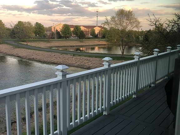 One-of-a-kind LOCATION! Unique property & newer end unit. Two sides of house look at water. Largest deck overlooking pond. Walk to downtown near restaurants, shops, river, parks, village hall, USPS, community events. Desirable Patriot Square community HOA. Master bedroom tray ceiling & walk-in closet. Extra storage with door entry under stairs. Two electric fireplaces included. Additional garage storage. Window tints for privacy. Walking paths great for pets.