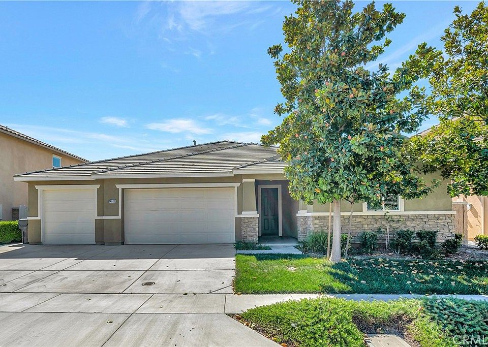 Single-story house! Gated community! Builder-installed solar panels and paid off! Energy Star Qualified! 3-Car garage! Welcome to 14603 Monet at Enclave! This gorgeous 4 Room 3 Bath newer home offers lots of light and an open floor plan. An elegant foyer with a coffered ceiling welcomes you once you step in. The smart layout offers a formal family room for cozy leisure time. The gourmet kitchen features an oversized island with an under-mount double basin stainless steel sink, Granite countertops and splash, stainless steel appliances, lower cabinet pull-out shelves, and a walk-in pantry. Tile flooring is throughout most of the living areas of the house. The large backyard is adorned with low-maintenance landscaping. The oversized master suite has one large walk-in closet and one storage room. A luxury master bathroom has an extended luxury marble counter, dual vanities, built-in storage, a soaking tub, and a walk-in shower. Designer finishes throughout include recessed lighting, chrome towel bar and paper holder, flat panel TV prewire in the Master and Great Room, 8’ Raised Panel doors, and many more. The solar on the roof will bring you a cool summer without burning a hole in your pocket. The family-friendly community offers a clubhouse, a junior Olympic-sized pool, a wading pool, 3 play areas, a dog park, BBQ picnic areas, a basketball court, and an outdoor fireplace. Award-winning schools. Close to shopping centers including The Marketplace, Eastvale Gateway Shopping Center, and Costo. 10-min drive to Ontario International Airport. Easy access to 15, 60, 71 and 91 freeways. This fantastic home is priced to sell fast. Don’t Wait!