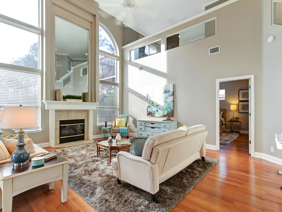 - Interior Amenities: Built-in-Bookshelves, Wall-to-Wall Carpet, Wood Floors, Sliding Glass Dr(s), Ceiling 8+ Ft.