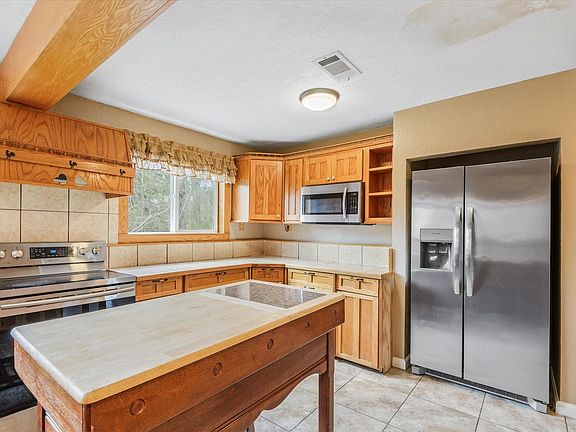 Stainless steel appliancesTwo oversized bedroomsSolid surface flooringSpacious country kitchenNearly a full acreCenter islandWarm wood cabinetry