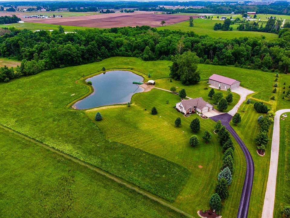 Private 11.9 acres off Hamilton Rd. with 1 acre stocked pond, 72x48 outbuilding with insulated workshop with 200amp and 14 foot rafters for RV storage. Updated kitchen, jet tub, hot tub, geothermal heat and air, Anderson windows, 3 skylights, vaulted and tray ceilings, radon system, large stamped concrete patio, long asphalt driveway, well landscaped lot with many trees, large daylight lower level with rec room, exercise room, 5th bedroom, full bath and bar, 4 full and 1 half baths, three car garage, patio has 4 ft footers for future enclosed 14x12 porch. Showings 3:00 PM and after during the week.