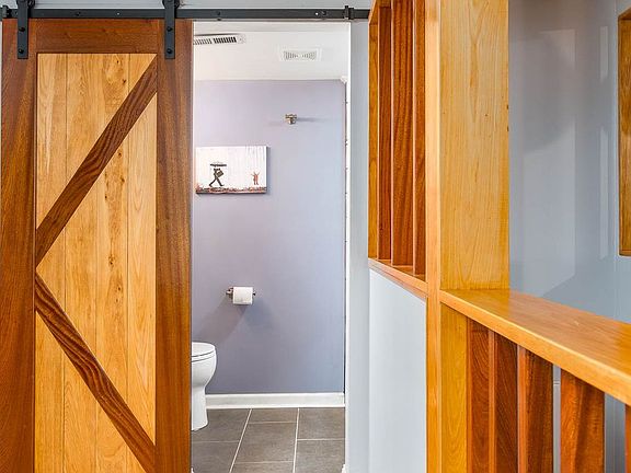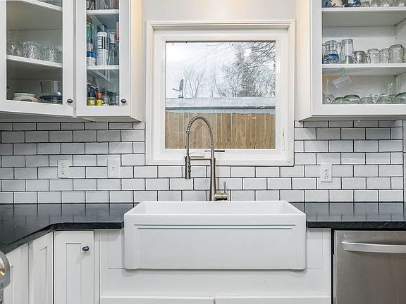 - Kitchen Cabinets/Counters: Glass Front Cabinets, Soapstone Counter