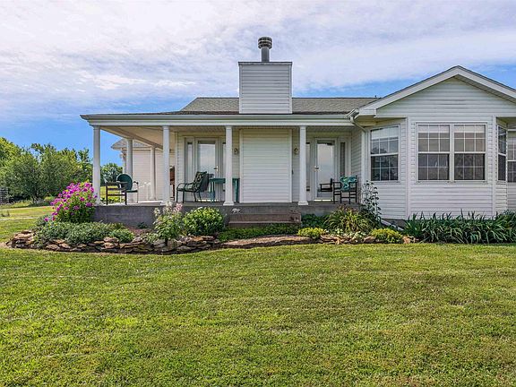 Sweeping views & soaring skies. Owl Hill Farm, situated on m/l 20 acres, presents the opportunity to enjoy splendidly picturesque views right out your front window every day. An easy drive to both Lawrence & Topeka, this true ranch 3 BR/ 2 bathroom home sits upon a full unfinished basement & possesses 1800+ sq. ft. of finished living space. The spacious kitchen w/ a butcher block island as its centerpiece gives way to a formal dining room & cozy, comfortable living room warmed by the wood-burning fireplace. Enjoy overlooking the valley to the North from your covered front porch or peaceful evenings in the side screened deck. Plentiful bird-watching opportunities, beautiful landscaping, a garden, a barn, & fields to roam make this place the essence of peaceful prairie living.