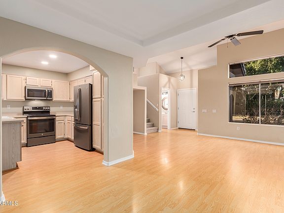 Situated in the tranquil and meticulously tended community of Countrywalk, this enhanced residence is conveniently positioned near a park, shopping outlets, and all the Chandler has to offer. The welcoming open concept showcases high ceilings, an abundance of sunlight, and inviting, neutral hues. The kitchen is adorned with state-of-the-art slate appliances, an eat-in area, and a breakfast bar. Upstairs, three generously-sized bedrooms and two complete bathrooms offer ample space. Homes in this community rarely become available.
